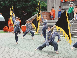 臺灣新竹縣“義民節”將于8月16日熱鬧登場,新竹客家舞蹈團昨天演出黑旗舞“義民爺”,預告精彩活動。圖片來源:臺灣《聯合報》。