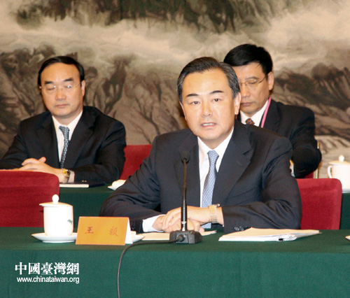 2008年臺商座談會28日上午在北京人民大會堂舉行。國務院副總理王岐山和國務院20多個主要部門負責人及60多位臺灣工商界人士、大陸臺商代表參加座談。圖為中共中央臺辦、國務院臺辦主任王毅在主持座談。(中國臺灣網 田云鵬 攝)