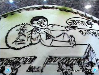 報道稱,這家糕餅店的蛋糕師傅將蛋糕做成扁扁的茶壺形狀,再噴上一個“貪”字,旁邊還有小茶杯寫著“珍”(陳水扁妻子吳淑珍)和“扁”,杯子倒過來象征“倒扁”,蛋糕師傅說:“杯子倒過來就是倒扁的意思,水果很多,表示他貪很多的意思。”