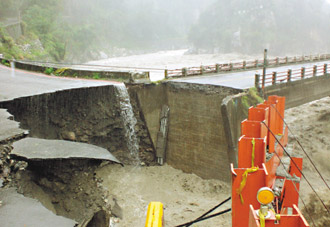 臺風“森拉克”挾帶的暴雨使臺中縣大甲溪暴漲,溪水將中橫公路32公里處篤銘橋一端的路基掏空,變成“斷頭橋”,臺“公路總局”已緊急封閉附近道路。(圖片來源:臺灣“聯(lián)合新聞網”)
