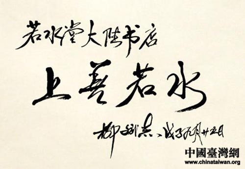 中國臺灣網(wǎng)9月27日消息 紀(jì)念海峽兩岸出版交流20年系列活動大陸代表團團長、新聞出版總署署長柳斌杰一行,9月25日上午赴若水堂大陸圖書高雄店參訪,柳斌杰署長親切會見了若水堂董事長宋東文并與之進行座談。宋東文對現(xiàn)階段臺灣地區(qū)簡體字圖書進口銷售經(jīng)營現(xiàn)況進行了簡報。會見后,柳斌杰署長揮毫為若水堂題字:“上善若水”。
