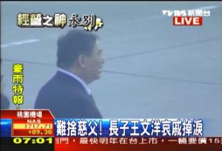 中國臺灣網10月17日消息 據臺媒報道,臺塑集團創辦人王永慶的遺體在夫人李寶珠等人的護送下于今天清晨6時30分抵達臺灣,前往機場迎靈的長子王文洋見到父親棺材那一刻百感交集、痛哭失聲。
