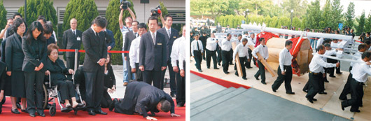 據報道,昨天上午將近9點時,除了王家親屬紛紛抵靈堂。9點吉時的迎棺,王永慶的妹妹王銀燕、王銀桂淚水不止,王永慶夫人李寶珠跪地叩首,陪父親離臺致猝死異鄉的王永慶女兒女王瑞華更是痛哭失聲;而部分親屬因篤信基督教,多以鞠躬表達哀思。
