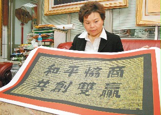 中國(guó)臺(tái)灣網(wǎng)11月5日消息 二次“陳江會(huì)”簽署協(xié)議的會(huì)場(chǎng)上,海基會(huì)送給海協(xié)會(huì)會(huì)長(zhǎng)陳云林的一幅鑲有6千個(gè)小金字的“和平協(xié)商,共創(chuàng)雙贏”金筆鏤空書法令人印象深刻,據(jù)臺(tái)媒報(bào)道,這是臺(tái)灣書法家詹秀蓉花了了七天七夜完成的作品。
