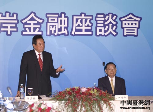 兩岸金融座談會今天上午在臺北圓山飯店舉行,海協會會長陳云林與;鶗麻L江丙坤出席。中國臺灣網 田云鵬攝