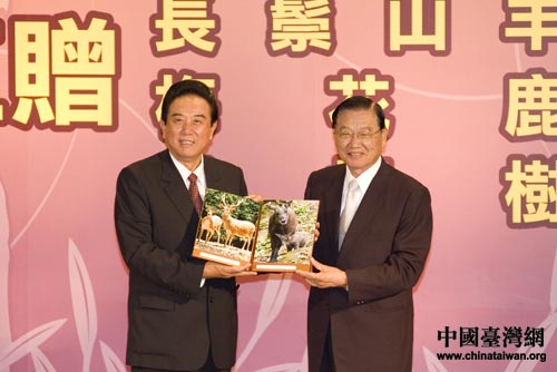 陳云林江丙坤舉行互贈儀式,陳云林向江丙坤贈送“團團”、“圓圓”圖譜,江丙坤向陳云林贈送長鬃山羊和梅花鹿圖譜。(本網特派記者田云鵬 發自臺北)