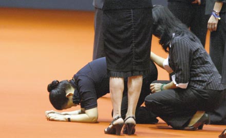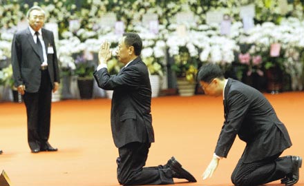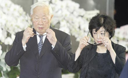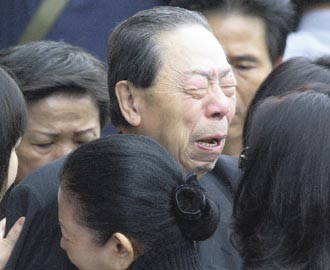 王永慶夫人李寶珠在靈堂前行跪拜大禮,思念丈夫的情緒與淚水一起宣泄。圖:臺灣《聯(lián)合報(bào)》