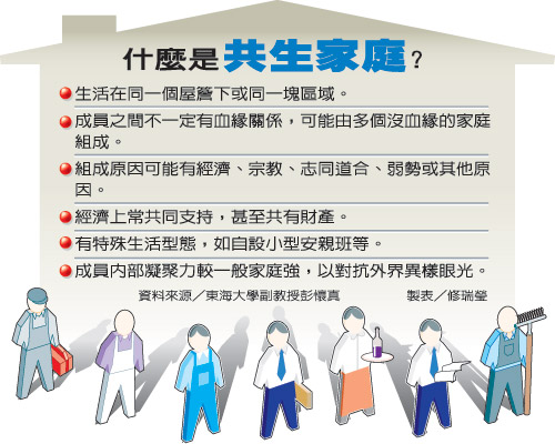 中國臺灣網(wǎng)11月20日消息 綜合臺媒報道,越來越多的“共生家庭”正在臺灣社會出現(xiàn),他們可能是一群志同道合的好友同住,也可能因理念、宗教關(guān)系共食共耕,彼此沒有血緣關(guān)系,但他們說“我們都是一家人”。曾研究這類家庭的臺灣東海大學(xué)社工系副教授彭懷真表示,隨著社會形態(tài)改變,另類共生家庭增多是可預(yù)期的,“血緣可能不再是唯一的緣。”