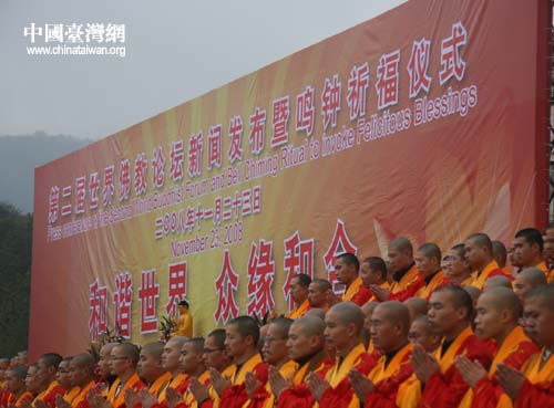 中國臺灣網(wǎng)11月24日無錫消息 昨天上午,第二屆世界佛教論壇新聞發(fā)布暨鳴鐘祈福儀式在無錫靈山舉行。中國佛教協(xié)會會長一誠長老、國際佛光會總會長星云大師、香港佛教聯(lián)合會會長覺光長老于同一時刻分別在無錫、高雄、香港三地敲響祈福鐘聲。帶著兩岸三地佛教界對世界和平、社會和諧、兩岸和睦的美好祝愿,莊嚴深沉的鐘聲遠揚。