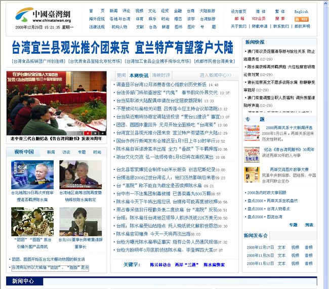 中國臺灣網12月29日消息 為適應兩岸交流大勢,中國臺灣網于2008年12月29日下午推出全新首頁。