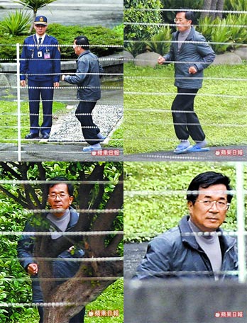 陳水扁進入花圃后,先深深地吸了一口清新自由空氣,簡單熱身后,就繞著花圃圓形水泥地,逆時針慢跑起來。為了避免發生意外,三名管理人員眼睛沒離開過他,不敢有絲毫放松,其中一人還全程拿著DV錄像。