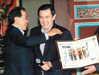馬英九(右)與大提琴家馬友友(左)昨在板橋林家花園對談,兩人相談甚歡,并在“雙馬高峰會”紀念簿上簽名。(臺灣《聯合報》圖片)