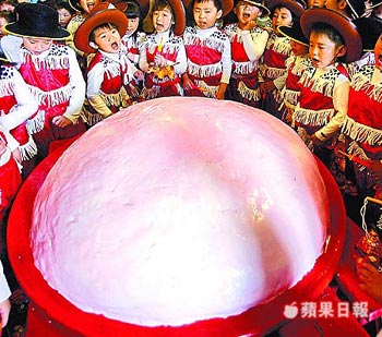 萬斤米糕桃。南投縣松柏嶺受天宮制作重1萬臺斤、號稱全臺最大的元宵超級米糕桃,昨舉行開香揭桃儀式。廟方表示,因玄天上帝腳踩龜、蛇,為了對龜神表示敬意,才將米糕龜改為米糕桃 。來源:臺灣《蘋果日報》
