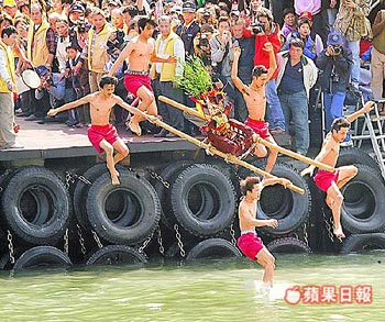跳海求降福。臺北縣野柳神明凈港文化祭昨天上午8時許登場,今年共有8頂神轎參與凈港,在加油聲浪中,壯丁們扛著神轎躍入冰冷海水,上岸后再進(jìn)行過火,祈求神明降福,現(xiàn)場熱鬧非凡。來源:臺灣《蘋果日報》