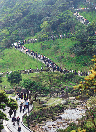 中國臺灣網(wǎng)2月16日消息 碧綠草地上,青翠竹林彷佛滴得出水;奇石水瀑旁,人龍靜靜蜿蜒,宛如油畫。3日圓寂的臺灣法鼓山創(chuàng)辦人圣嚴(yán)法師骨灰昨天植存于金山環(huán)保生命園區(qū),逾3萬名信眾繞著之字形山路前行,形成巨大壯觀的圖案,5小時后才緩緩散開。