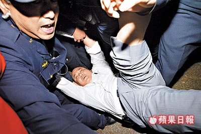 “扁家護衛隊”成員紀錦章昨與法警發生沖突,被抬離法院移送法辦。來源:臺灣《蘋果日報》