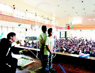 昨天魔法師用巨大的吹泡泡器,吹出一道大彩虹,把兩個學生吹進泡泡里,全場驚奇叫聲,直喊再演一次。魔法師強調,只要大家用心,任何生活物品都可創造無限的神奇。