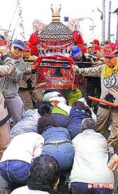 大甲媽祖繞境,信眾擠成三排趴在濕冷馬路上爭鉆轎底。來源:臺灣《蘋果日報》