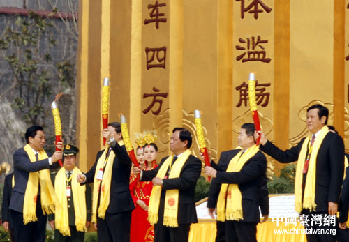 在全國臺聯(lián)會長梁國揚等嘉賓向臺港澳同胞及海外華僑華人代表分贈寓意中華民族薪火相傳、生生不息的“圣火”后,己丑年黃帝故里拜祖大典告成。