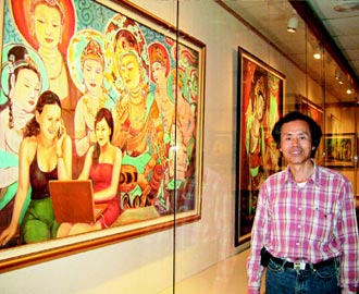 中國臺灣網3月31日消息 據臺灣《聯合報》報道,以畫古厝出名的一名臺灣鄉土畫家魏慶發,近日舉辦的“蓬萊之美”畫展中有3幅風格迥異的大型作品,而其中最讓人不解的就是畫中的佛像都在看電腦。對此,魏慶發解釋,畫了20年的鄉土景物,未來希望轉型融合古今的題材,展現對時代的反思。