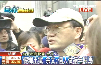 中國臺灣網4月6日消息 據臺灣TVBS報道,前臺北市政府秘書余文,6日上午10時步出監獄。余文在馬英九特別費案中,因為偽造文書被判處有期徒刑1年,從去年的6月13日服刑,已經過了9個多月,因為在獄中表現良好聲請假釋,臺灣法務主管部門日前核準。