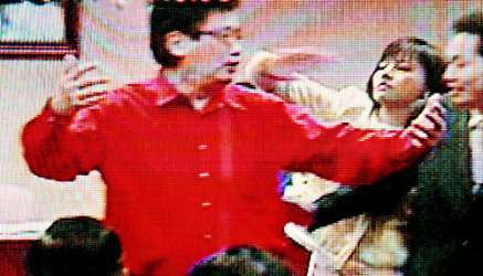 民進黨“立委”邱議瑩(中)上午不滿國民黨“立委”李慶華(左)發言時說她“沒家教”、“潑婦”,上前甩了李慶華一巴掌,并在散會后上前追打。來源:臺灣聯合晚報