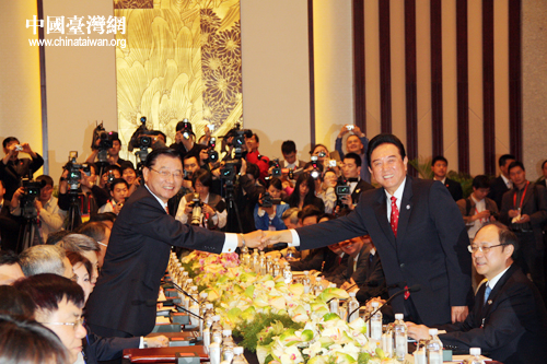 陳云林與江丙坤握手。26日上午9時,海峽兩岸關系協會會長陳云林與海峽交流基金會董事長江丙坤第三次會談在南京紫金山莊正式舉行。(中國臺灣網 鐘寶華 攝)