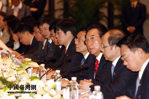 海協會會長陳云林(右三)致辭。26日上午9時,海峽兩岸關系協會會長陳云林與海峽交流基金會董事長江丙坤第三次會談在南京紫金山莊正式舉行。(中國臺灣網 鐘寶華 攝)