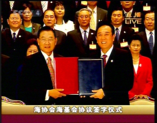 陳云林與江丙坤互換協議文本。海協會會長陳云林與臺灣海基會董事長江丙坤26日下午在南京紫金山莊會議中心紫金廳簽署《海峽兩岸空運補充協議》、《海峽兩岸金融合作協議》、《海峽兩岸共同打擊犯罪及司法互助協議》。(中央電視臺截圖)