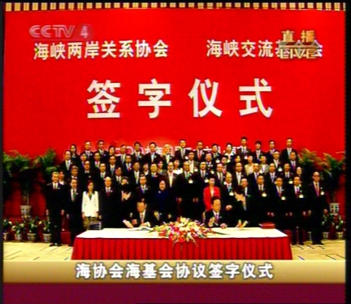 陳云林與江丙坤簽署協議。26日下午,海協會會長陳云林與臺灣海基會董事長江丙坤26日下午在南京紫金山莊簽署《海峽兩岸空運補充協議》、《海峽兩岸金融合作協議》、《海峽兩岸共同打擊犯罪及司法互助協議》。(中央電視臺截圖)