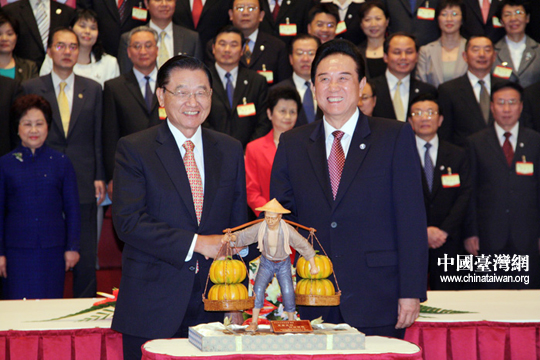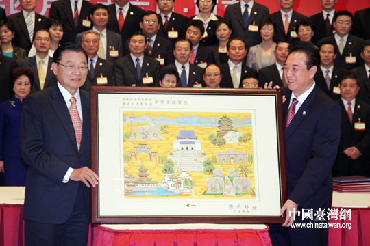 陳云林向江丙坤贈送一幅云錦。26日下午,在成功簽署《海峽兩岸空運補充協議》、《海峽兩岸金融合作協議》、《海峽兩岸共同打擊犯罪及司法互助協議》等三項協議后,陳云林與江丙坤互贈紀念品。(中國臺灣網 鐘寶華 攝)