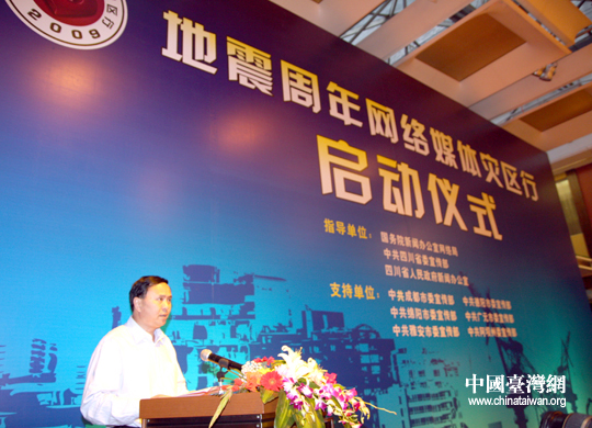 5月5日,四川省委宣傳部常務副部長、省政府新聞辦主任侯雄飛在“地震周年網絡媒體災區行活動”啟動儀式上致辭。當晚,“地震周年網絡媒體災區行活動”在四川省成都市啟動,來自全國50家中央和各省(區、市)重點新聞網站及知名商業網站,將在今后的8天時間里深入災區一線,聚焦災區重建見證抗震救災精神!。ㄖ袊_灣網 田云鵬 攝)