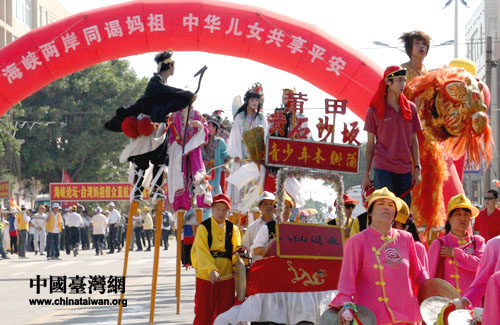 為歡迎臺灣媽祖信眾,湄洲民眾獻上精彩的民俗踩街表演。(中國臺灣網(wǎng)記者 張弛 攝)