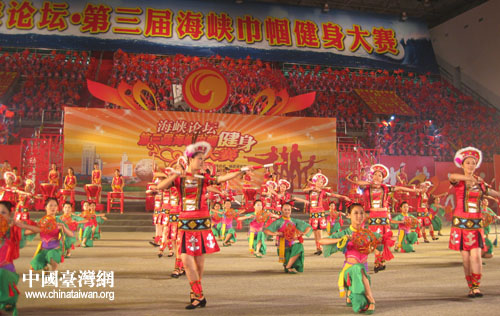 中國臺灣網5月17日泉州消息 海峽論壇·第三屆海峽巾幗健身大賽今天晚上8點在泉州僑鄉體育館隆重舉行。來自福建省9個設區市、省直機關、省個私協及臺港澳共14個代表團的1000多名女性云集美麗的花園城市泉州,盡展風采,聯誼交流,生動體現了海峽兩岸姐妹一家親的深厚情誼,充分展示了海峽兩岸姐妹熱愛生命,追求卓越的時代風采。