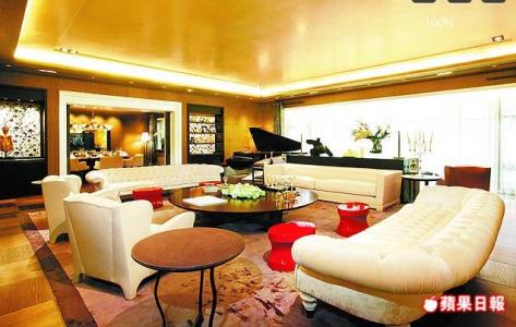 客廳使用中空樓板強化隔音;1200萬元的FAZOL鋼琴擺在客廳大器奢華。圖片來源:臺灣《蘋果日報》