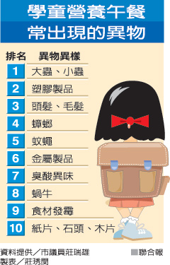 報道稱,臺北市議員莊瑞雄、黃向羣、劉耀仁昨天指出,臺北市小學生吃的營養午餐,常出現抹布、蟑螂、小蟲等異物“加料”,實在惡心。臺北市教育局及衛生局都表示,將嚴格加強把關。臺北市長郝龍斌在臺北市議會備詢時也承諾,將盡快檢討有關罰則。他說,學童營養午餐的質量不容打折,一定會以高標準篩選掉不良廠商。