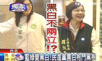 報道稱,“立法院”議場內,“立委”穿得花花綠綠難分你我,以后在議場對決,都穿戰袍的話就會變成“黑白分明”,國民黨黑、民進黨白,對綠營有無形的加分效果;不過,國民黨“立委”卻說一幫人穿得這么白,實在不吉祥。