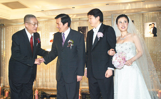 國(guó)民黨副主席吳敦義次子吳子文(右二)昨天辦喜宴,馬英九(左二)等臺(tái)灣黨政要人幾乎全部到齊。(圖片來源:臺(tái)灣《聯(lián)合報(bào)》)