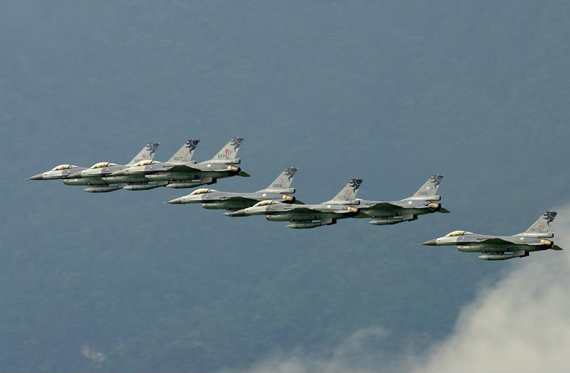 臺軍現(xiàn)役F-16A/B戰(zhàn)機(jī)編隊(duì)飛行。(圖片來源:新華網(wǎng))