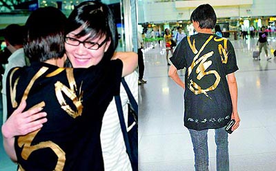 馬英九的妻子周美青昨天前往機(jī)場為小女兒馬元中送行,所穿紀(jì)念T恤今天引發(fā)臺灣民眾搶購。圖片來源:臺灣《聯(lián)合報》《蘋果日報》