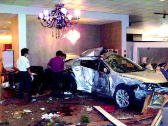 位于蘭陽大橋南端的上雅居家具行,前晚11時許還在營業,店員正帶客人看家具,突然聽到“吱”一聲尖銳摩擦聲,接著“轟”的一聲,整臺銀色小轎車側撞進來,迎路整片落地玻璃撞碎,家具被撞飛,霹靂啪啦一片狼藉。