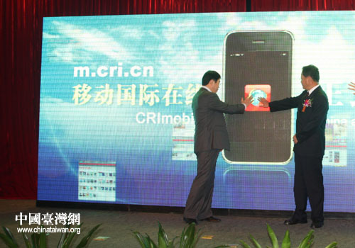 “移動國際在線”今天在北京正式啟動,圖為國家廣電總局副局長田進(jìn)(左)、國際廣播電臺臺長王庚年按下啟動圖標(biāo)。(中國臺灣網(wǎng) 張弛 攝)