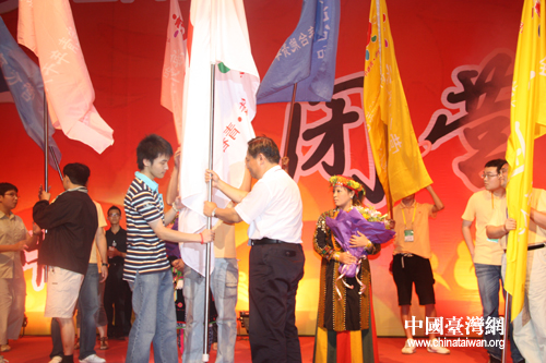 全國臺聯(lián)會(huì)長梁國揚(yáng)代表全國臺聯(lián)收回本屆夏令營總營旗。(中國臺灣網(wǎng) 張蕾 攝)
