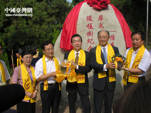 在一棵小樹前,參加“情系長(zhǎng)安——兩岸文化聯(lián)誼行”活動(dòng)的臺(tái)灣嘉賓團(tuán)長(zhǎng)程建人與榮譽(yù)團(tuán)長(zhǎng)焦仁和,分別拿出了專程從臺(tái)灣帶來(lái)的阿里山的土和日月潭水,輕輕倒進(jìn)樹坑中,寓意兩岸同胞同根同祖、一脈相承,中華文化源遠(yuǎn)流長(zhǎng),萬(wàn)古長(zhǎng)青。阿里山土與日月潭水倒入黃陵的土中后,馬上與橋山黃陵的泥土混為一色,分不出哪是來(lái)自臺(tái)灣的土,哪是黃陵的土。