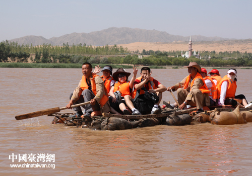 兩岸媒體記者乘坐羊皮筏子在黃河上漂流。(中國臺灣網 楊永青 攝)