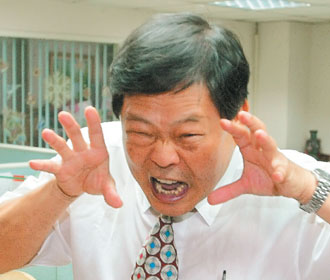 范振宗27日上午宣布退出民進黨,面對鏡頭以夸張的表情表示:“大陸記者拍得都比你們好!”圖片來源:臺灣《聯合報》