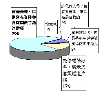 這次民調的詳細結果為:選項一:“許范兩人得了便宜又賣乖,被除名是自找的”只有140票,占整體票數7.2%;選項二“早應該除名,夜長夢多中評會被搞得兩面不是人”獲得44票,占整體票數2.3%;選項三“先停權后除名,顯示民進黨進退失據”302票,占整體票數15.4%;選項四“停權無理,民進黨在登陸與貪腐間做了錯誤選擇”高達1447票,占整體票數74%;選項五“沒意見”23 票,只占整體票數1.2%。