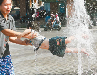 昨天新竹飆到39.4度今年最高溫,各地天氣熱到讓小朋友受不了,由大人抱到噴水池邊沖涼消暑。(圖片來源:臺灣《聯合報》)