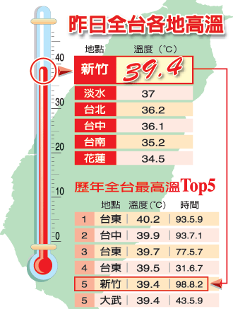 據報道,昨天高溫都出現在臺灣北部,除了新竹,第二、第三高溫分別是淡水與臺北。
