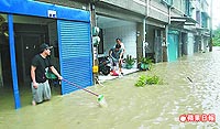 高雄縣梓官鄉(xiāng)淹水,市場(chǎng)攤販仍硬著頭皮擺攤,表情無奈。來源:臺(tái)灣《蘋果日?qǐng)?bào)》